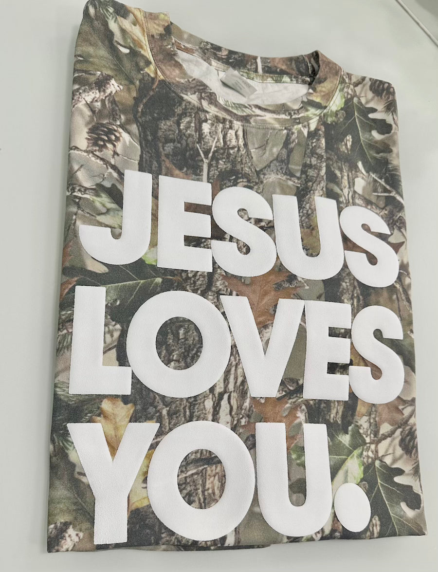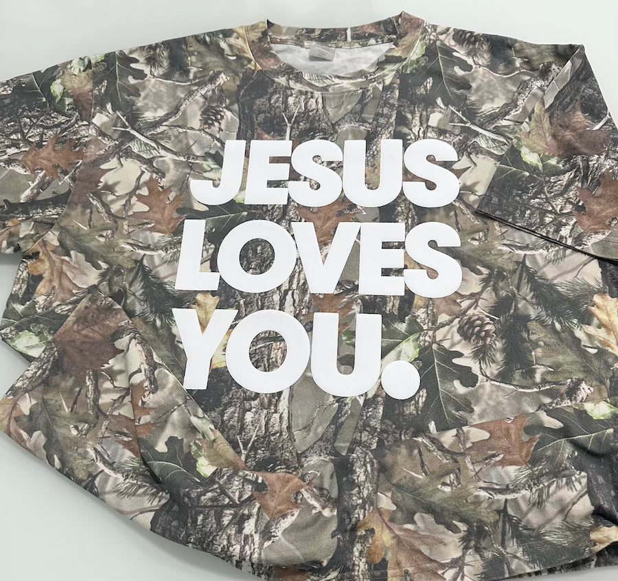 Stand bold in faith and style with our “Jesus Loves You” Oversized Tee in traditional camo tones.